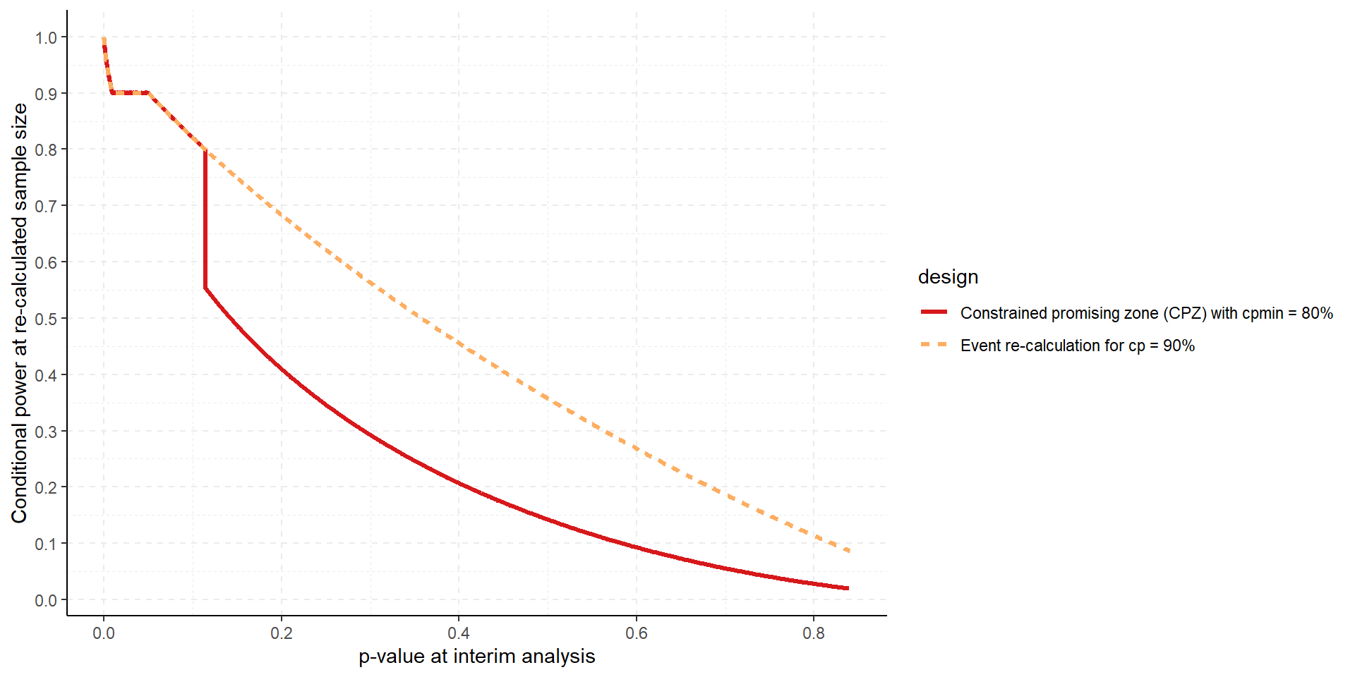 If conditional power for 140 additional events at HR = 0.75 exceeds \(cp_{max}\), set number of additional events = 140, otherwise calculate event number according to \[CP_{HR = 0.75} = cp_{max}\] (promising case)
