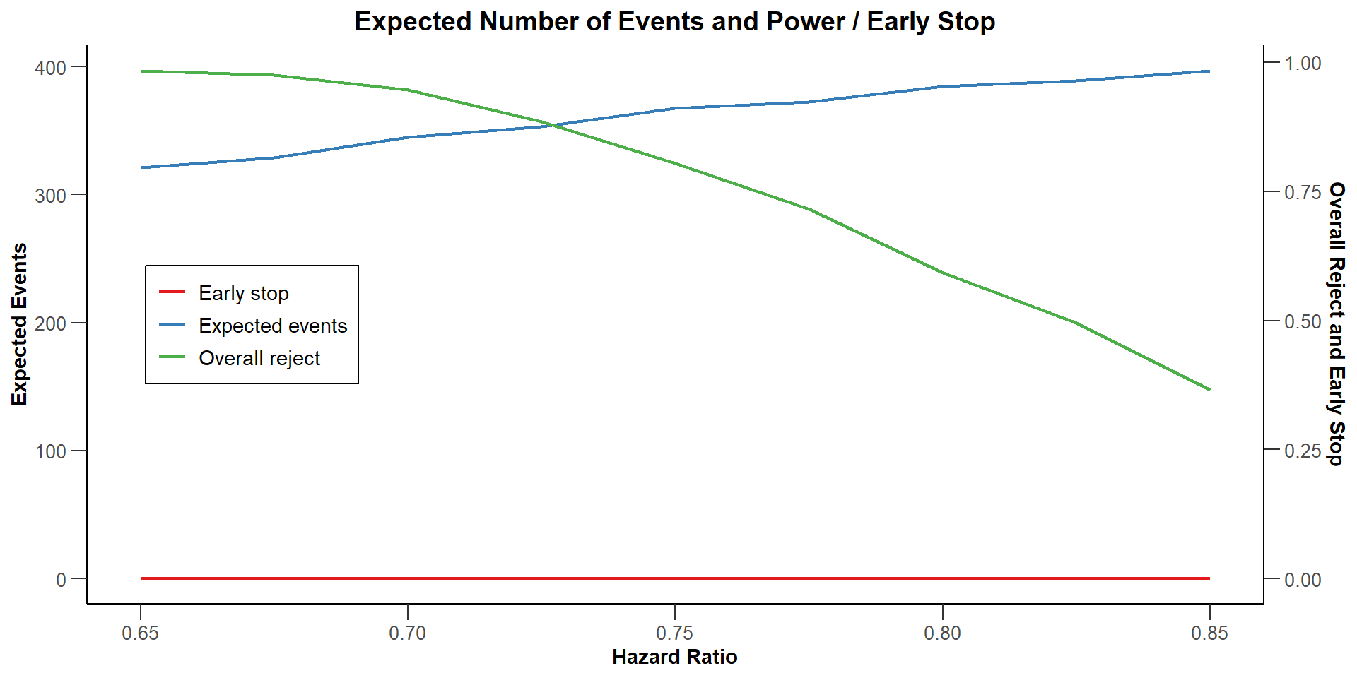 getPowerSurvival(alpha = 0.025, hazardRatio = 0.67,