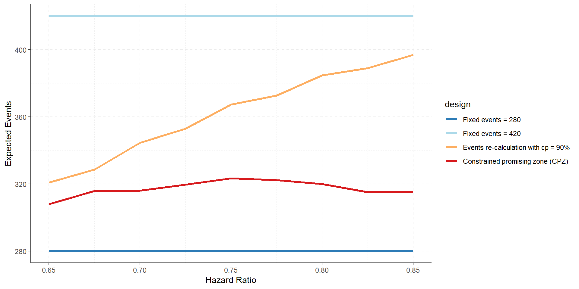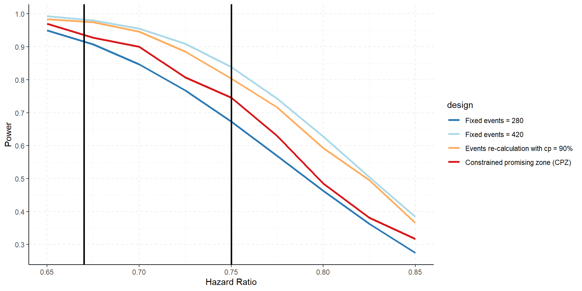 If conditional power CP for detecting HR = 0.75 falls in a “promizing zone”, an additional investment would be made that allows the trial to remain open until 420 PFS events were obtained