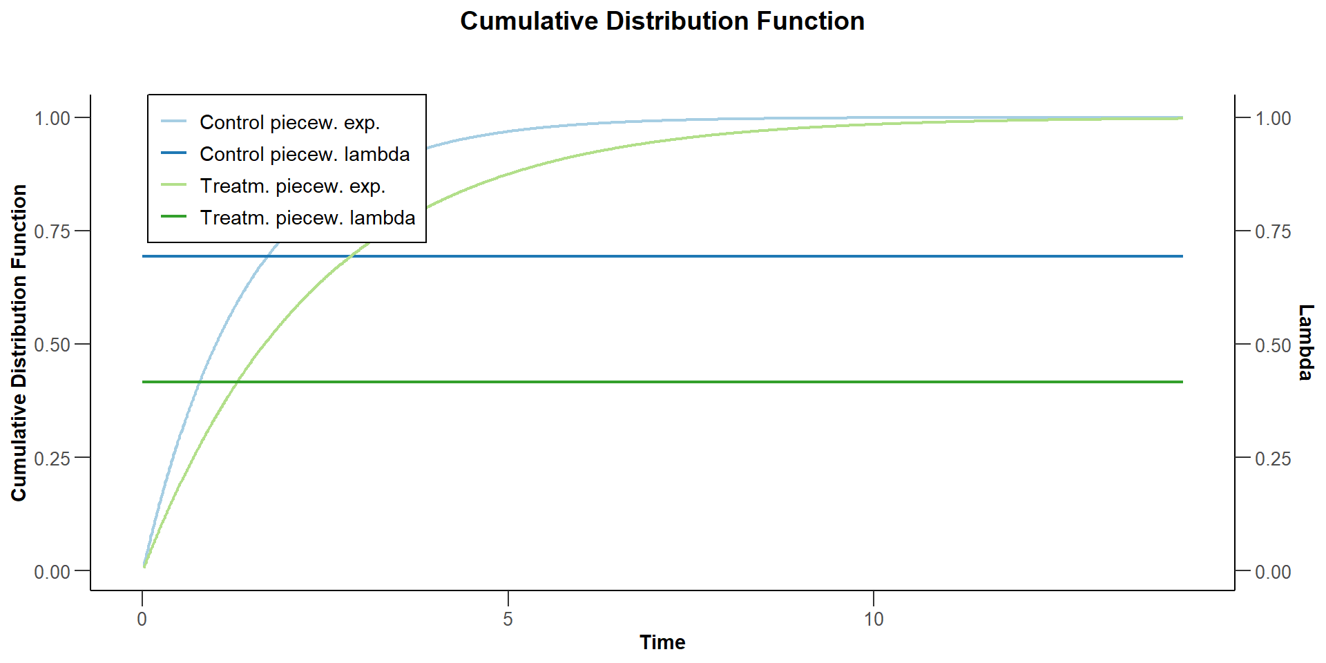 Suppose now that the control arm follows a piecewise exponential distribution. For the first year the hazard rate is 1.3, and thereafter the hazard rate is 0.5.