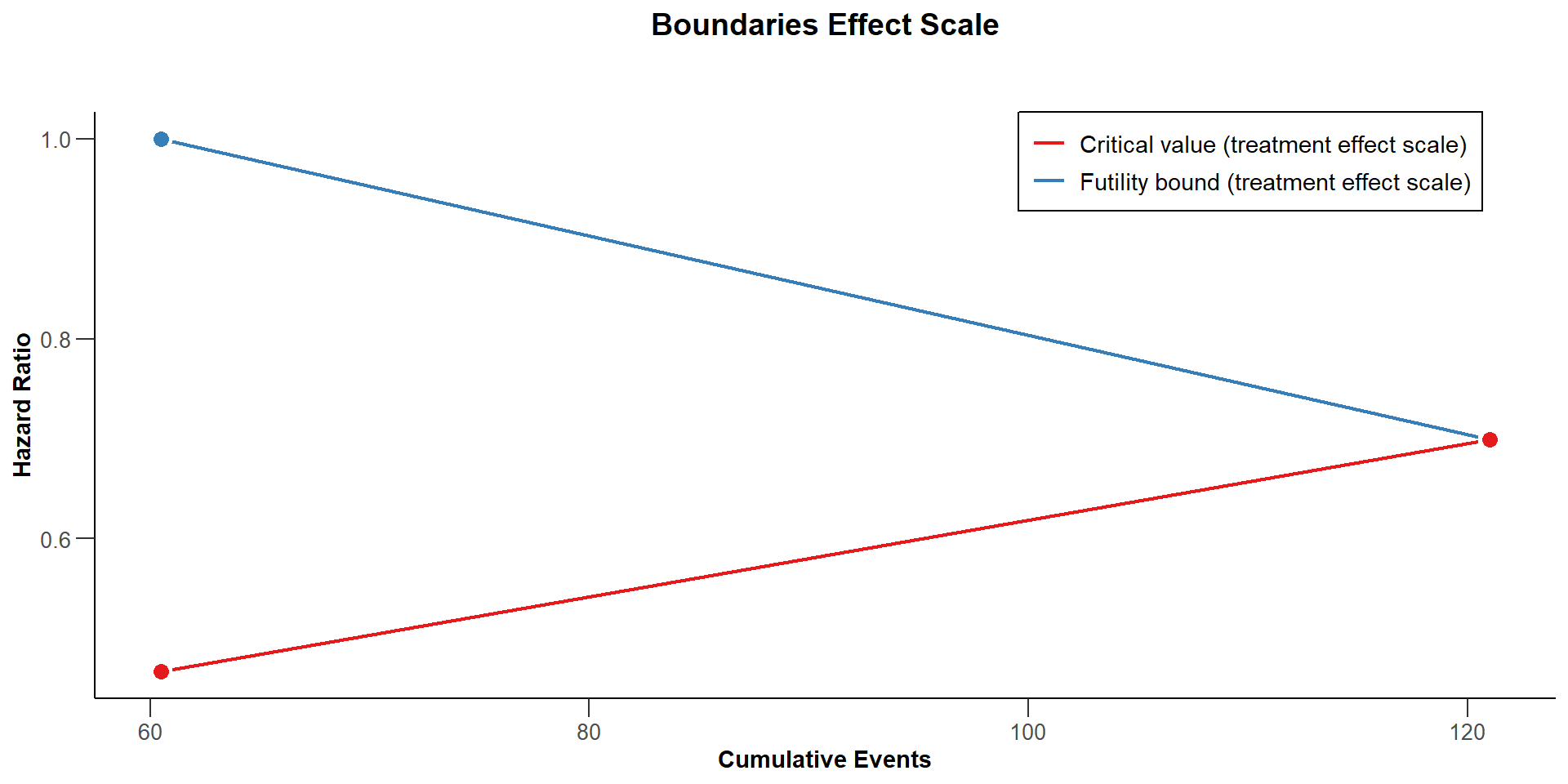 NOTE: the function getDesignGroupSequential() doesn’t know which direction of Z statistic indicates treatment benefit. By default, the critical values are displayed assuming positive Z is beneficial.