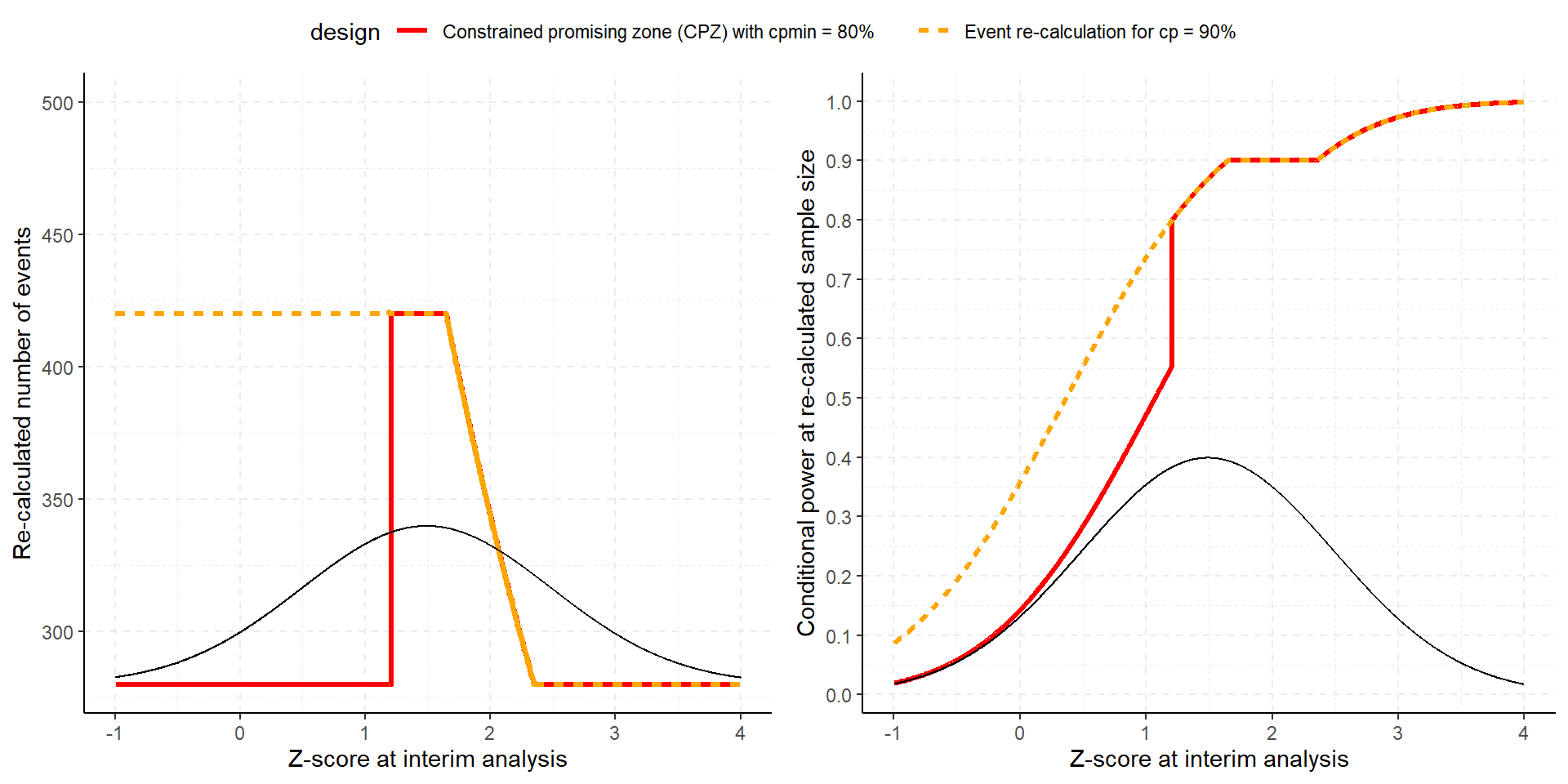 If conditional power for 140 additional events at HR = 0.75 exceeds \(cp_{max}\), set number of additional events = 140, otherwise calculate event number according to \[CP_{HR = 0.75} = cp_{max}\] (promising case)