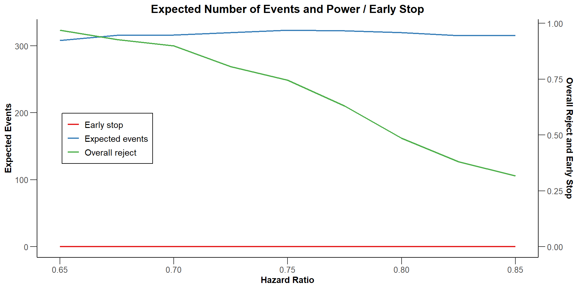 getPowerSurvival(alpha = 0.025, hazardRatio = 0.67,